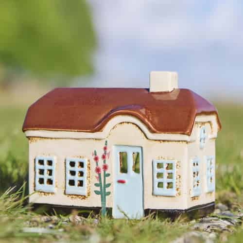 Ib Laursen Haus für Teelicht "Ebeltoft" hellblaue Tür - Stockrosen