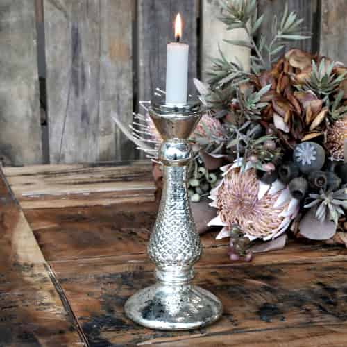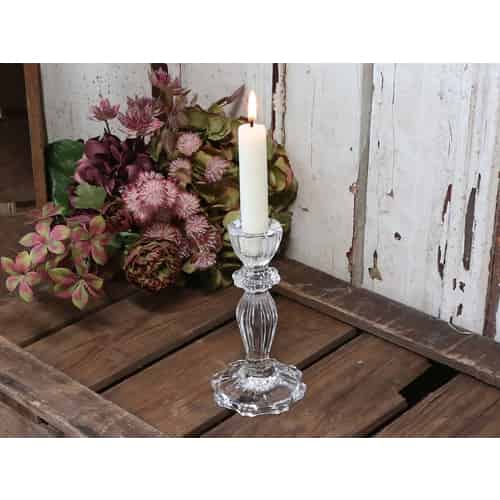 Der Chic Antique Kerzenständer mit Schliffen ist aus Glas und Eisen gemacht und hat ein hübsches Antik Silber Finish. Der formschöne Kerzenhalter ist ein gut aussehendes Wohnaccessoire mit einem nostalgischen Look. Der Kerzenhalter ist passend für eine Kerze mit einem Diameter von 2,2 cm. Bestückt mit einer brennenden Kerze, verbreitet der Kerzenständer Antik Silber mit Schliffen von Chic Antique stilvoll eine beruhigende Atmosphäre im Raum.