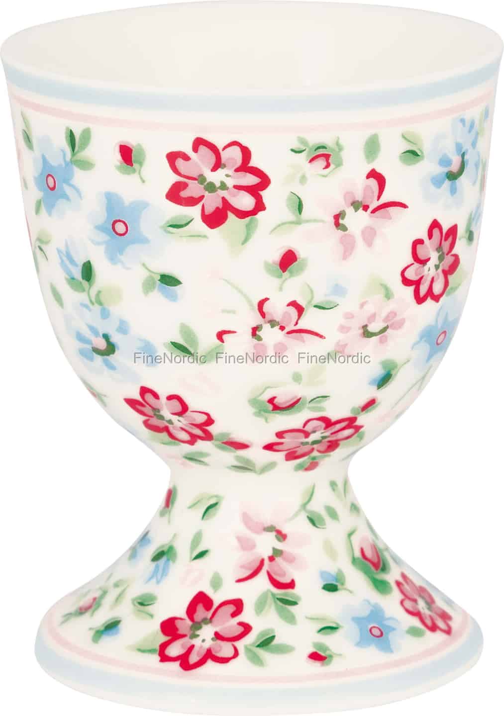Lassen Sie den sanften Charme der Kollektion Louisa White Ihre Morgen erhellen. Inspiriert von der stillen Schönheit eines blühenden Gartens, verwandelt dieser exquisite Eierbecher von GreenGate ein einfaches Frühstück in ein liebgewonnenes Ritual. Jedes florale Detail, von den leuchtend roten Blüten bis zu den zarten blauen Vergissmeinnicht, verteilt sich über die glatte Keramikoberfläche und erschafft ein farbenfrohes Mosaik, das sich zugleich frisch und nostalgisch anfühlt. Die feinen Streifen in blassem Rosa und Blau am Rand und am Fuß sorgen für einen perfekten, durchdachten Abschluss.