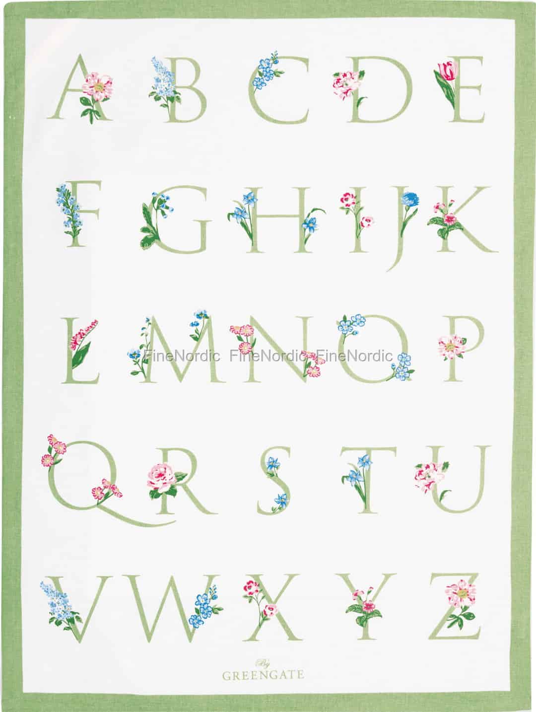 Bringen Sie einen Hauch von verspieltem Lernen und botanischer Schönheit in Ihre Küche. Dieses entzückende Baumwoll-Geschirrtuch von GreenGate verwandelt einen einfachen Haushaltshelfer in ein kleines Kunstwerk, das klassische Typografie mit dem zarten Charme eines Sommergartens verbindet.