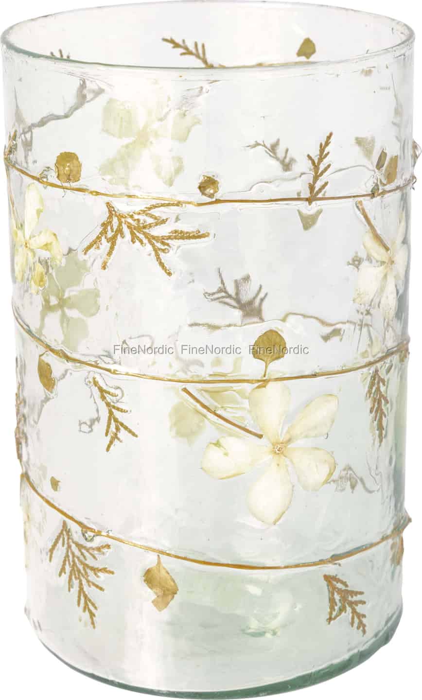 In der stillen Schönheit einer wilden Wiese liegt eine besondere Magie – ein Gefühl, das GreenGate in dieser exquisiten Glas-Hurricane kunstvoll eingefangen hat. Jedes Stück erzählt eine eigene Geschichte, mit zarten cremefarbenen Blüten und filigranen Farnen, die wie in der Zeit schwebend im sanft gewellten Glas eingeschlossen sind. Es ist eine Hommage an die Unvollkommenheiten der Natur und ihre flüchtigen, kostbaren Momente, geschaffen, um ein Gefühl der Ruhe und des Staunens in Ihren Wohnraum zu bringen. Die sanften, organischen Formen der Botanicals stehen in einem wunderschönen Kontrast zu den klaren Linien der drei goldenen Bänder, die einen leisen Hauch von Raffinesse hinzufügen.
