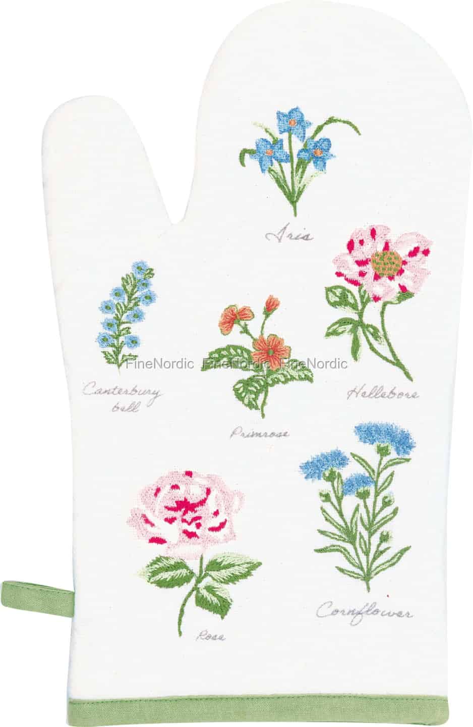 Stellen Sie sich vor, Sie bringen die zarte Schönheit eines Landgartens in Ihr Zuhause. Dieser bezaubernde Grillhandschuh von GreenGate ist mit einer feinen botanischen Stickerei verziert, die ein einfaches Küchenutensil in ein kleines Kunstwerk verwandelt.