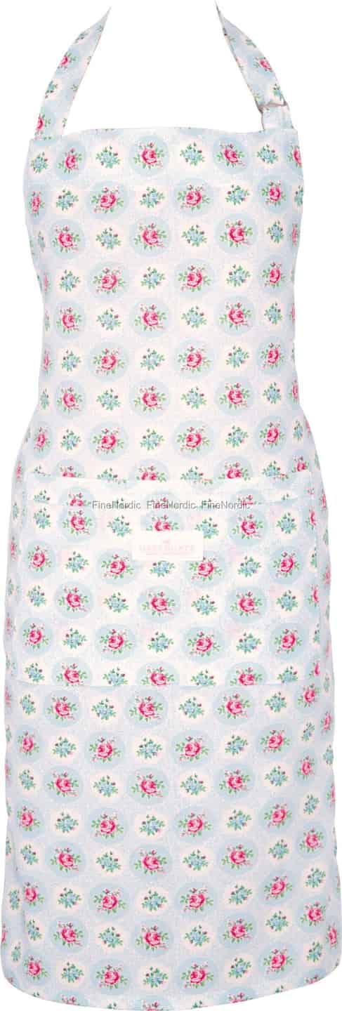 Das bezaubernde Muster, ein Markenzeichen des Designerbes von GreenGate, zeigt zarte rosa Rosen und winzige blaue Blüten, die über einen Untergrund in Hellblau und Creme verstreut sind. Mit ihrem großzügigen Schnitt und einer praktischen Vordertasche für Ihre Werkzeuge oder Rezepte verbindet diese Schürze zeitlose Schönheit mit alltäglicher Zweckmäßigkeit. Sie ist ein Stück, das dafür geschaffen ist, Erinnerungen zu schaffen – für jene Momente, die es wert sind, geteilt zu werden.