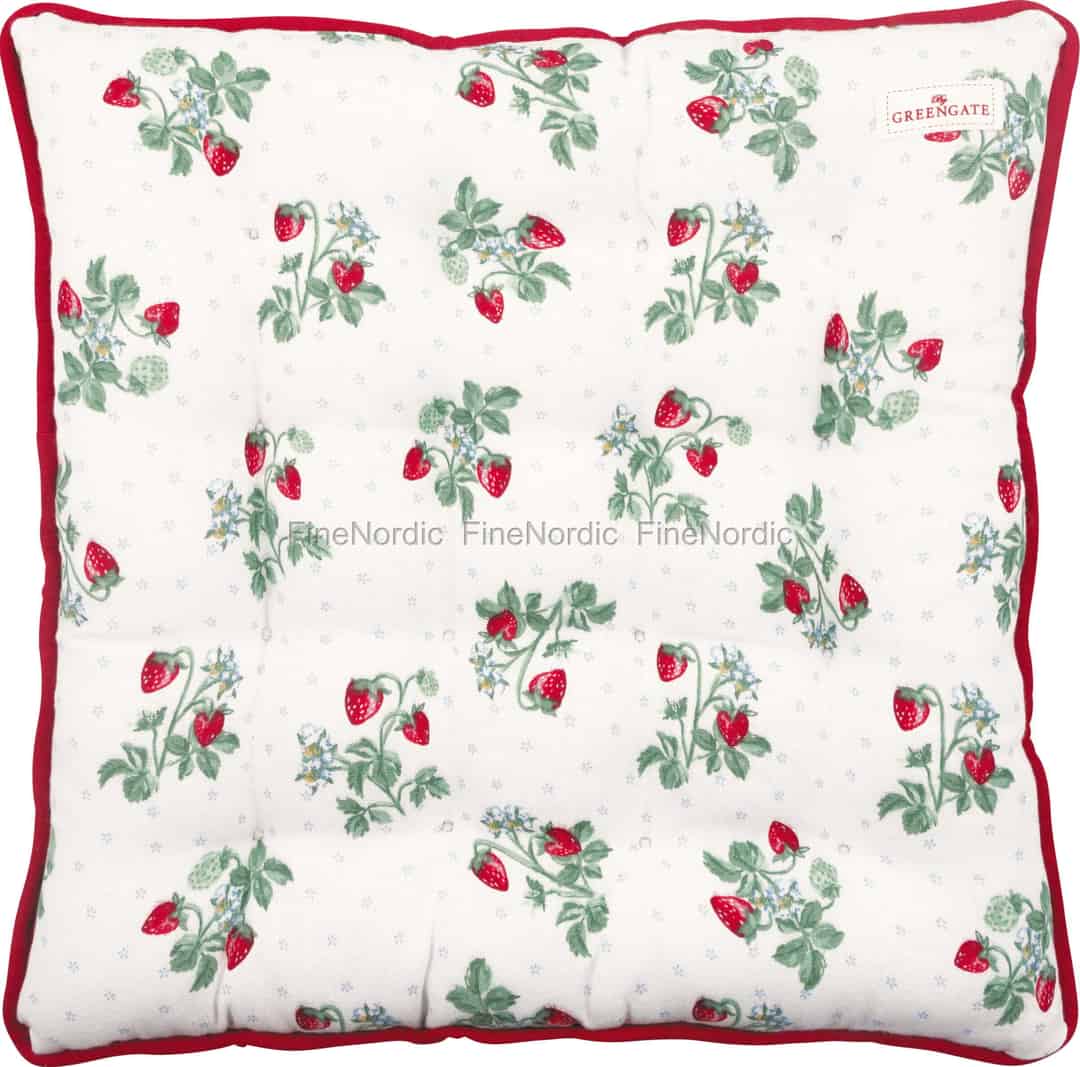 Stellen Sie sich die Wärme eines Sommernachmittags in einem skandinavischen Garten vor. Dieses entzückende Sitzkissen von GreenGate fängt dieses Gefühl perfekt ein, mit seinem bezaubernden Muster aus reifen Erdbeeren und zarten Blüten. Es ist eine Einladung, Platz zu nehmen, zu entspannen und einen ruhigen Moment zu genießen.