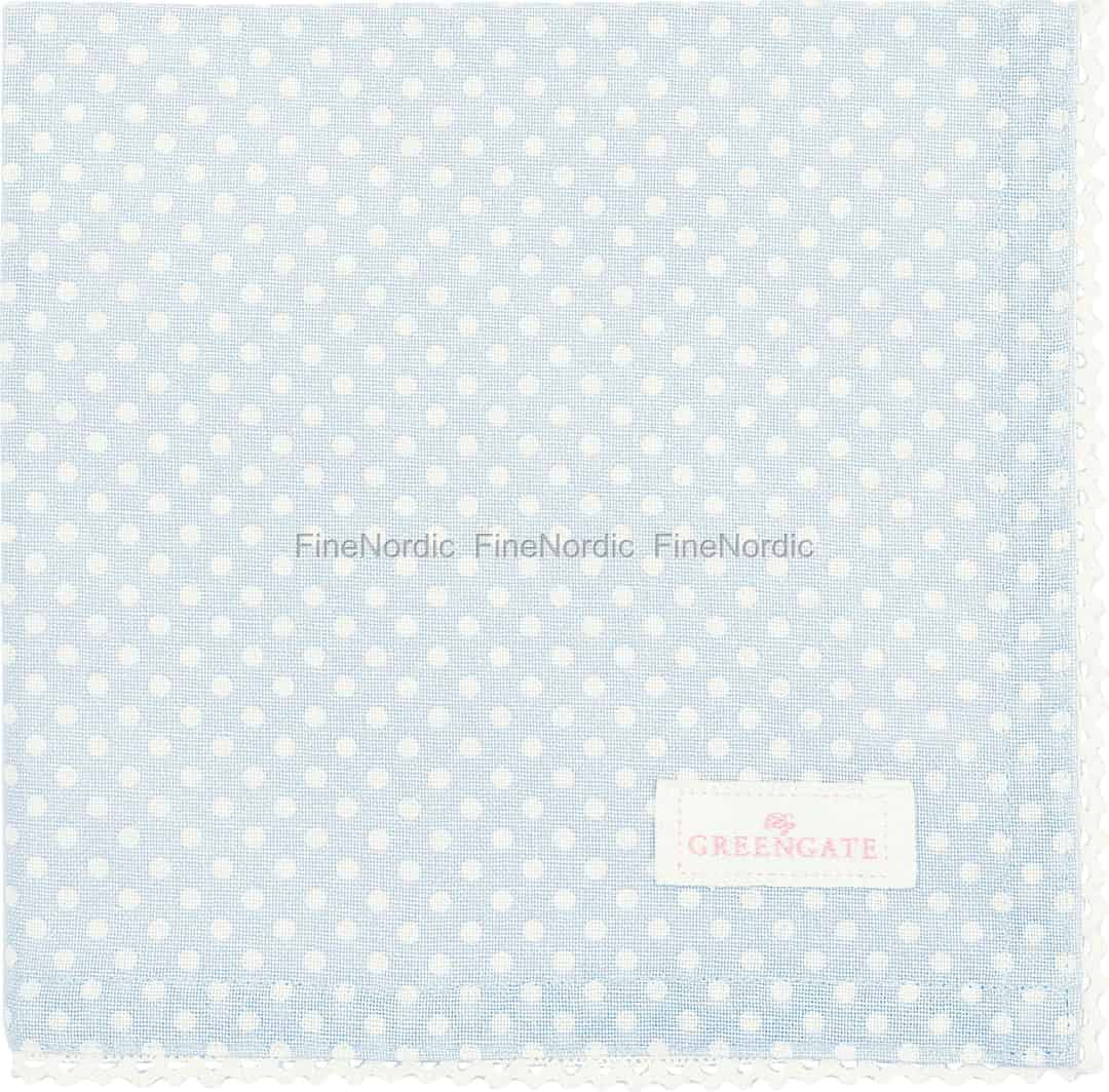 Stellen Sie sich einen Tisch vor, gedeckt für einen ruhigen Morgenkaffee oder einen fröhlichen Nachmittagstee. Diese bezaubernde Stoffserviette von GreenGate, mit ihren zartblauen Tupfen und dem feinen Spitzenrand, verleiht diesen einfachen Momenten einen Hauch zeitloser skandinavischer Romantik.