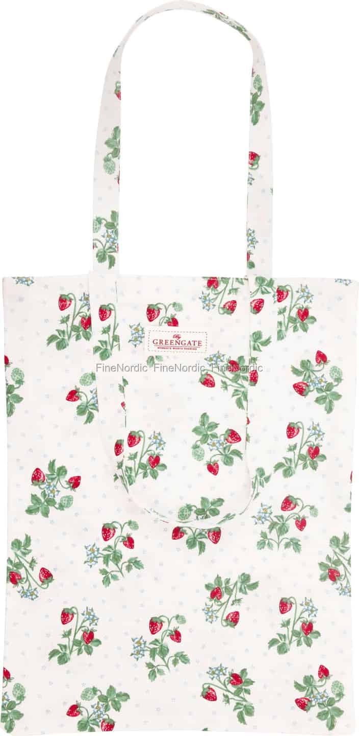 Stellen Sie sich einen Spaziergang durch einen sonnenverwöhnten Garten vor, den Korb in der Hand. Diese charmante GreenGate Tasche fängt genau dieses Gefühl ein, mit ihrem entzückenden Muster aus süßen Erdbeeren und zarten Blüten, die über blütenweiße Baumwolle verstreut sind.
