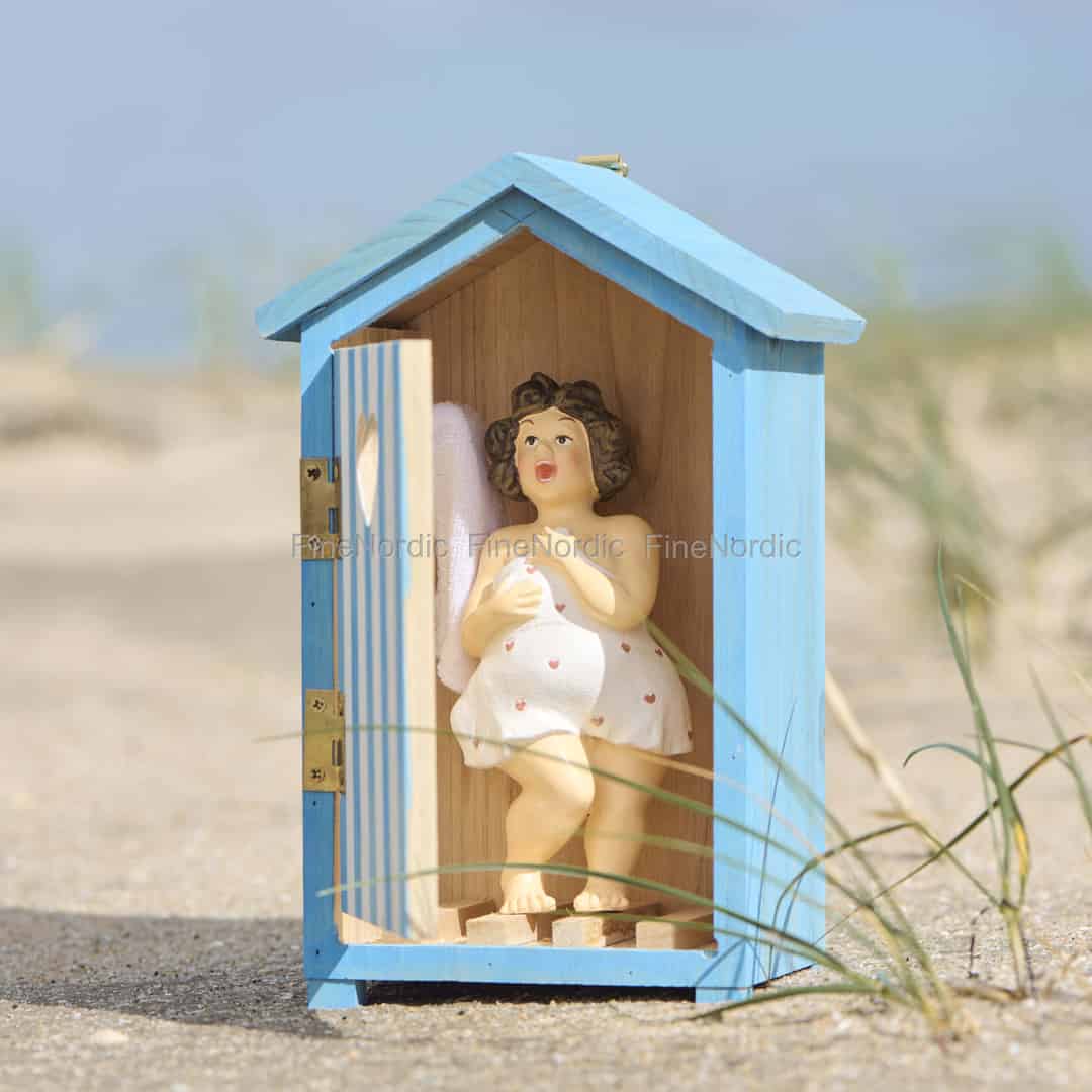 - Authentisches, rustikales Finish: Das bezaubernde Badehäuschen aus Holz, in einem sanften, verwitterten Blau gehalten, vermittelt ein rustikales, handgefertigtes Gefühl, das Ihrer Einrichtung Wärme und Authentizität verleiht.