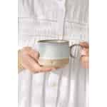 Stellen Sie sich vor, wie Ihre Hände diesen wunderschönen Keramikbecher umschließen und die wohlige Wärme Ihres Lieblingsgetränks spüren. Sein einzigartiges Design lädt zu einem Moment des Innehaltens ein und verbindet eine glatte, reaktive Glasur mit der erdigen Textur von unglasiertem Ton zu einem wahrhaft sinnlichen Erlebnis.