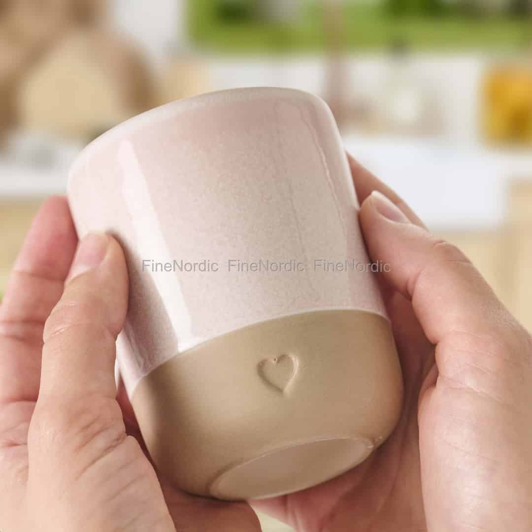 Dieser Becher ist für die kostbaren Momente der Stille gedacht – den ersten Kaffee am Morgen, wenn die Sonne aufgeht, oder einen beruhigenden Kräutertee vor dem Schlafengehen. Seine henkellose Form lädt dazu ein, ihn zu umschließen und Geborgenheit in seiner Wärme zu finden. Das süße, eingeprägte Herz ist eine leise Erinnerung daran, Freude in den kleinen Dingen zu finden. Ein wirklich besonderes Stück, das einen Hauch von authentischer skandinavischer *hygge* in Ihr Zuhause bringt.
