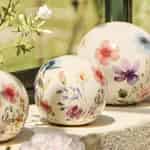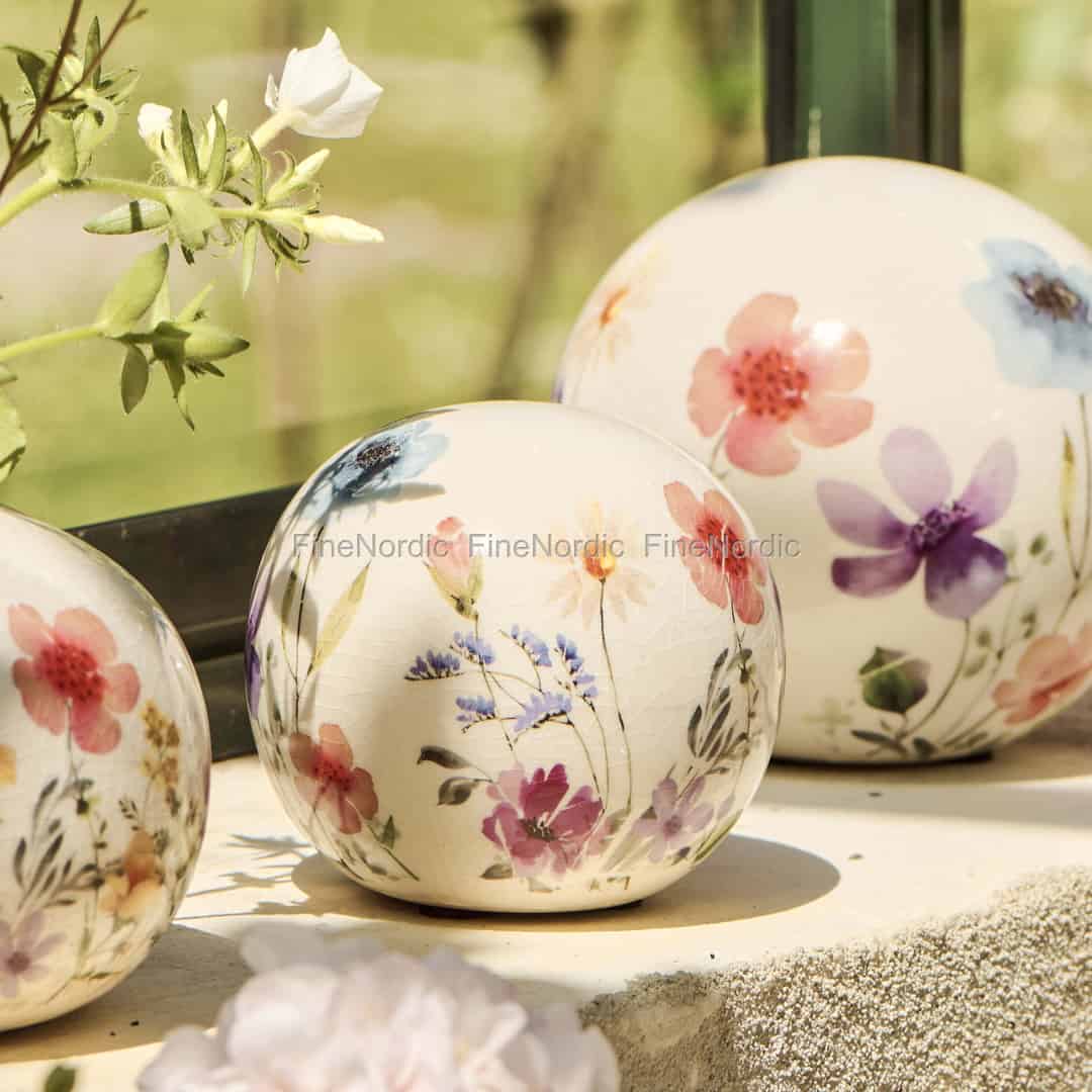 Laden Sie die zarte Schönheit einer Sommerwiese mit dieser bezaubernden Dekokugel in Ihr Zuhause ein. Jede Keramikkugel ist mit filigranen Wildblumen im Aquarellstil verziert, die sich von einer cremefarbenen, krackelierten Glasur abheben, die von zeitlosem Charme flüstert.