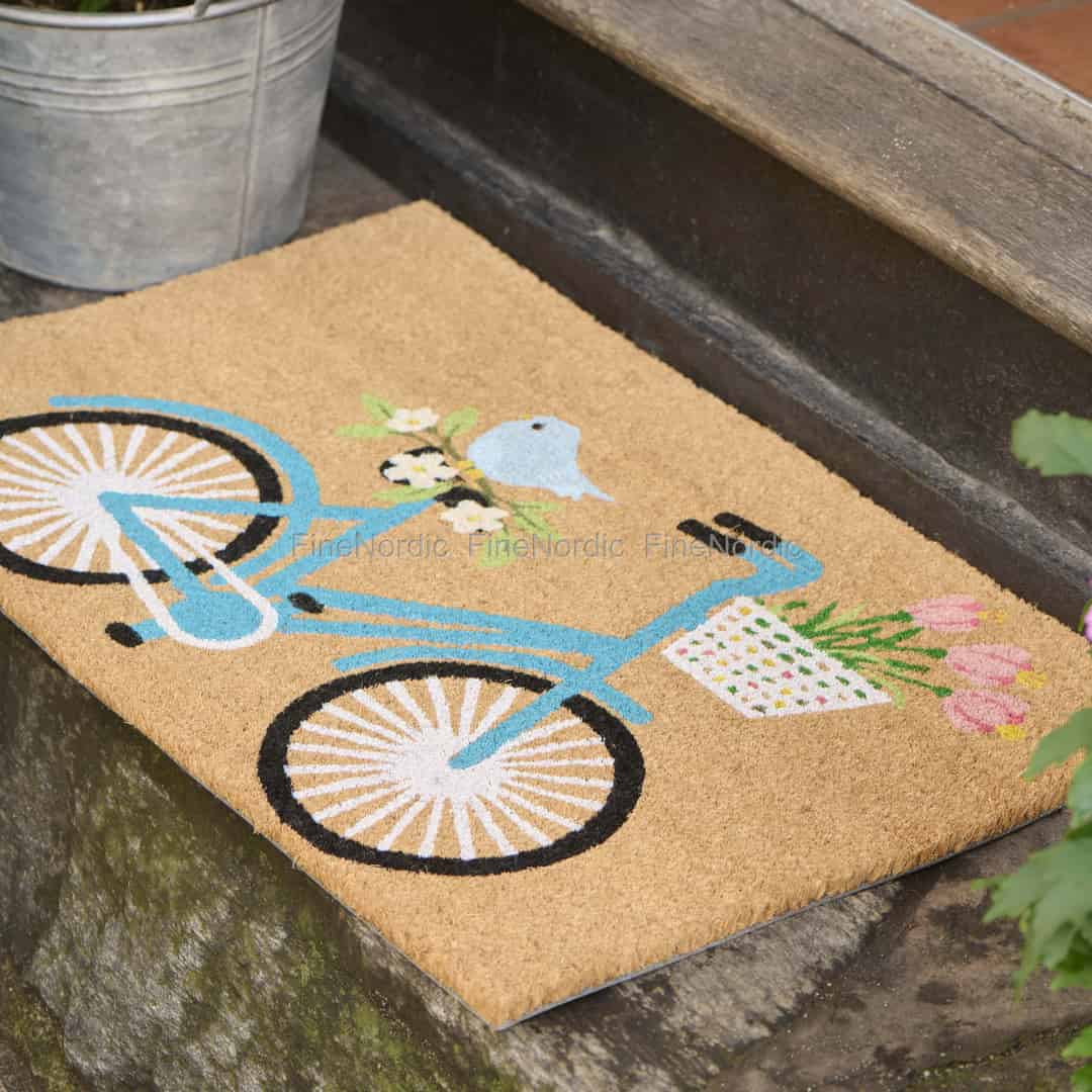 Lassen Sie die Geschichte Ihres Zuhauses an der Türschwelle beginnen. Diese Fußmatte von Ib Laursen fängt die schlichte Freude einer Fahrt über Land ein, mit ihrem wunderschön illustrierten Fahrrad, das bereit für einen Ausflug zum Wochenmarkt ist. Der Korb quillt über vor rosa Tulpen, während ein süßer kleiner Vogel für die Fahrt mitgekommen ist – eine Szene, die Ihnen mit Sicherheit ein Lächeln ins Gesicht zaubern wird. Sie ist mehr als nur eine Matte; sie ist ein kleines Kunstwerk, das einen einladenden, fröhlichen Ton für Ihr gesamtes Zuhause angibt.