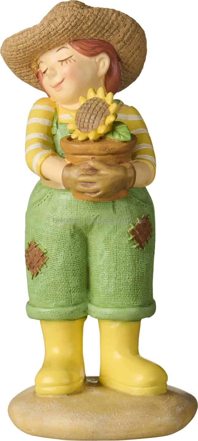 Lernen Sie eine der entzückendsten Gartenfreundinnen von Ib Laursen kennen, eine Figur, die das Herz eines ländlichen Bauerngartens verkörpert. Mit geschlossenen Augen in einem Moment stiller Zufriedenheit hält sie eine frisch getopfte Sonnenblume, ein Symbol für Wärme und Glück. Ihre fröhlich gelben Gummistiefel, das gestreifte Oberteil und die geflickte grüne Latzhose erzählen die Geschichte eines gut verbrachten Tages, an dem sie sich um die Dinge gekümmert hat, die wachsen. Jedes Detail ist so gestaltet, dass es ein Gefühl von friedlichem, rustikalem Leben hervorruft.