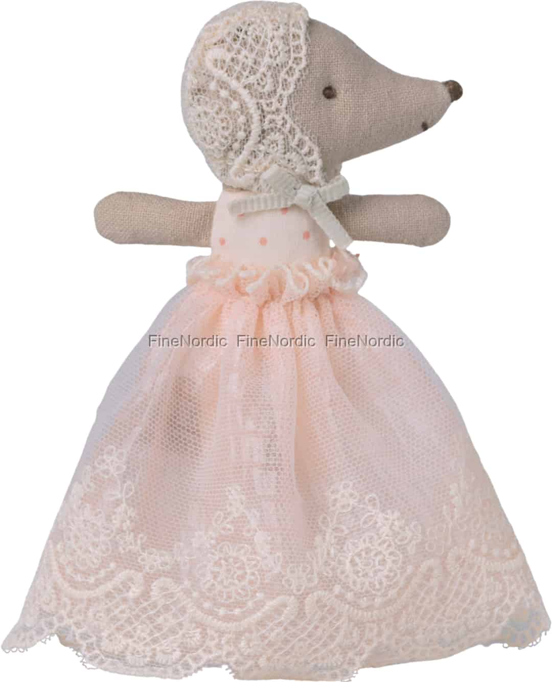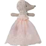 Dürfen wir vorstellen: das neueste kleine Mitglied der Maileg-Familie, bereit für ein märchenhaftes Nickerchen oder einen großen Ball. Gekleidet in ihr feinstes puderrosafarbenes Kleidchen und eine zarte Spitzenhaube, haucht diese Babymaus der Fantasiewelt Ihres Kindes einen Hauch von Vintage-Charme ein.