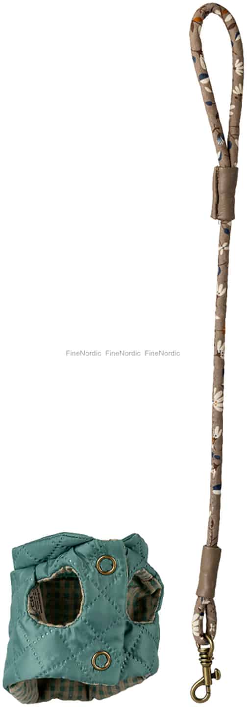 Jeder liebgewonnene Spielzeugfreund verdient es, an den Abenteuern des Tages teilzuhaben. Dieses exquisite Set aus Geschirr und Leine von Maileg wurde entworfen, um diese Geschichten zum Leben zu erwecken. Stellen Sie sich vor, wie Ihr Kind seinem Lieblings-Plüschwelpen oder -kätzchen sorgfältig das weiche, gesteppte mintfarbene Geschirr anlegt, dessen Vichy-Karo-Futter ein süßes, verstecktes Detail ist. Der einfach zu bedienende, messingfarbene Verschluss klickt ein, und mit der geblümten Leine in der Hand sind sie bereit, die Welt gemeinsam zu erkunden, einen fantasievollen Schritt nach dem anderen.