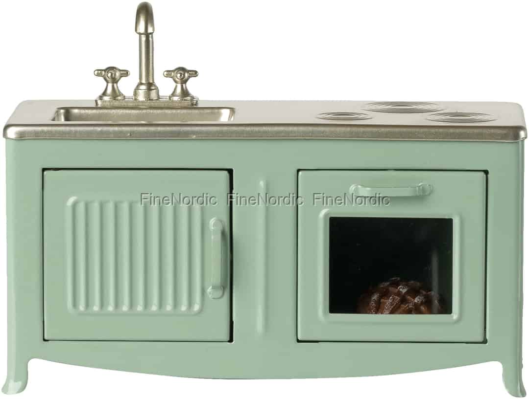 Stellen Sie sich das sanfte Treiben in Ihrem Maileg-Mäusehaus vor, das sich ganz um diese entzückende Küche dreht. Mit ihrer zarten mintfarbenen Lackierung und den liebevollen Vintage-Details ist sie die perfekte Kulisse für Ihre kleinen Freunde, um winzige Leckereien zu backen und unzählige Geschichten auszutauschen.