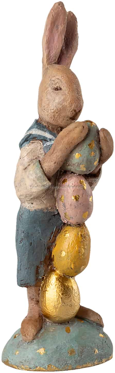 Heißen Sie dieses Ostern ein kleines Stück aus der zauberhaften Welt von Maileg in Ihrem Zuhause willkommen. Mit seinem süßen Matrosenkragen und einem Arm voller kostbarer, goldgesprenkelter Eier sieht der Hase Nr. 12 aus, als wäre er direkt den Seiten eines geliebten Märchenbuchs entsprungen. Die rustikale, strukturierte Oberfläche des Polyresins verleiht ihm eine zeitlose Erbstück-Qualität und lädt Sie ein, sich die wundervollen Geschichten vorzustellen, die er erzählen könnte. Er ist nicht nur eine Dekoration, sondern ein Charakter, der bereit ist, Teil der geschätzten Frühlingstraditionen Ihrer Familie zu werden.