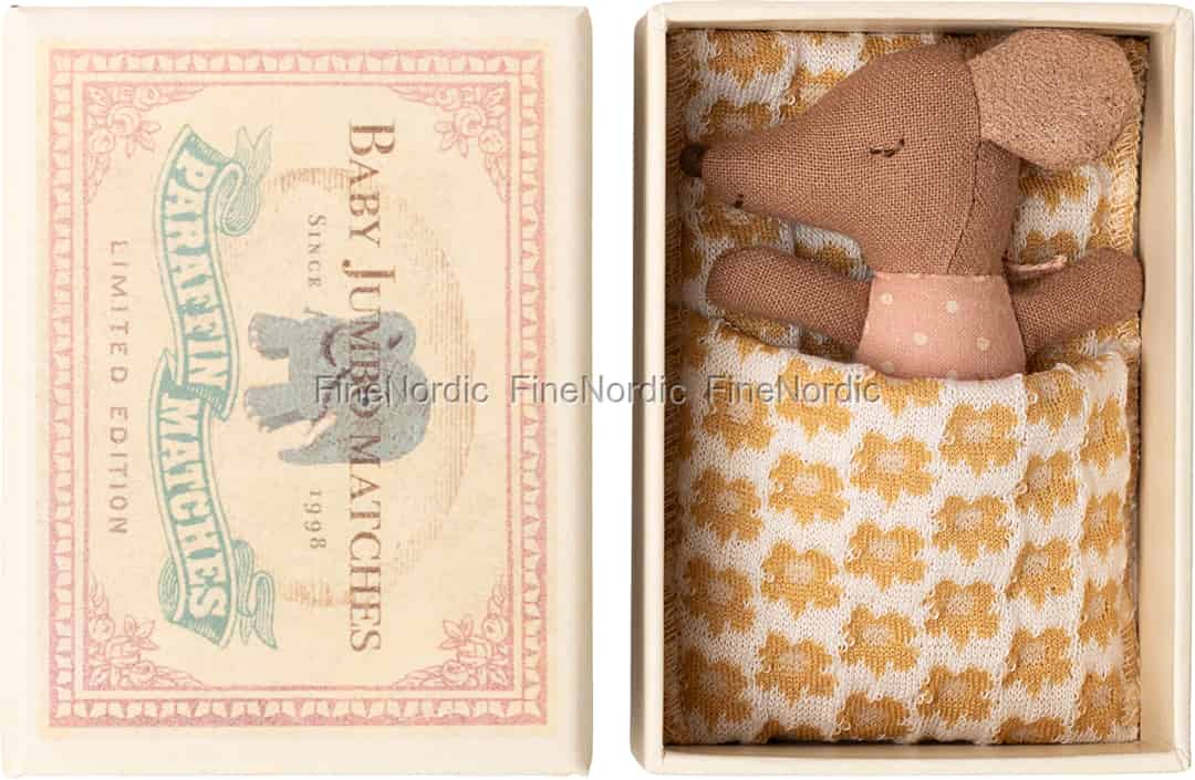 Entdecke die leise Magie von Maileg mit dieser zauberhaften Sleepy Wakey Babymaus. Schiebe die von Vintage inspirierte Streichholzschachtel auf und finde das winzigste neue Mitglied deiner Familie, das sich gemütlich in seinen geblümten Schlafsack kuschelt. Gefertigt aus griffigem, weichem Stoff und gekleidet in einem süßen, rosafarbenen Pünktchen-Outfit, steckt dieser kleine Freund voller Charakter – von seinen weichen Ohren bis hin zu seinem zart gestickten Gesichtsausdruck. Er ist ein Schatz, der darauf wartet, entdeckt zu werden und endlose Momente des ruhigen, fantasievollen Spiels verspricht.