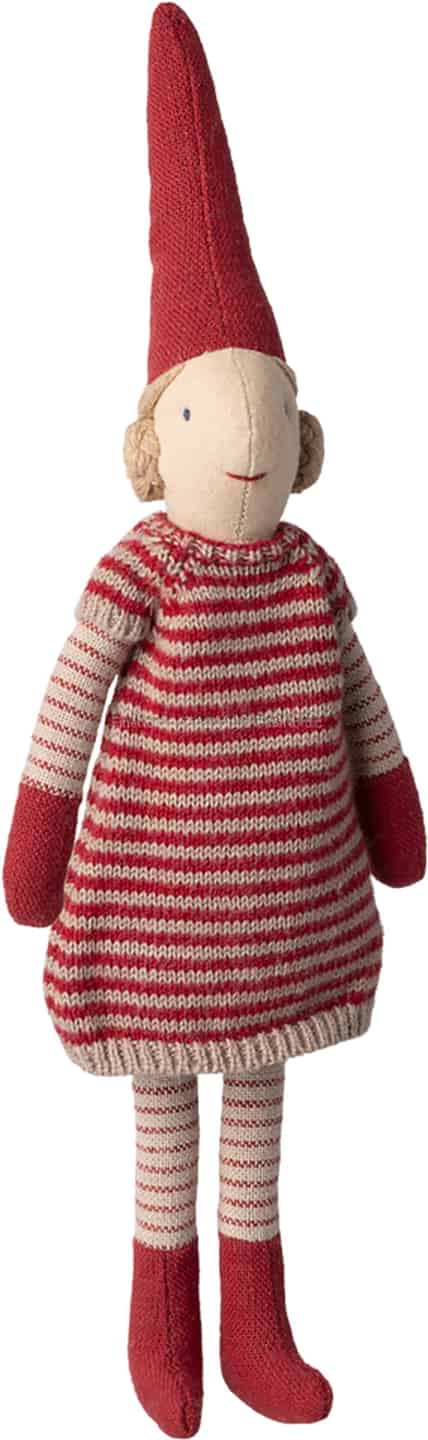 Lernen Sie Ihre neue festliche Freundin aus der zauberhaften Welt von Maileg kennen. Gekleidet in ein gemütliches, gestreiftes Strickkleid in Rot und Creme, ist dieses kleine Wichtelmädchen bereit, die Wärme und das Wunder der Weihnachtstraditionen Ihrer Familie zu teilen.