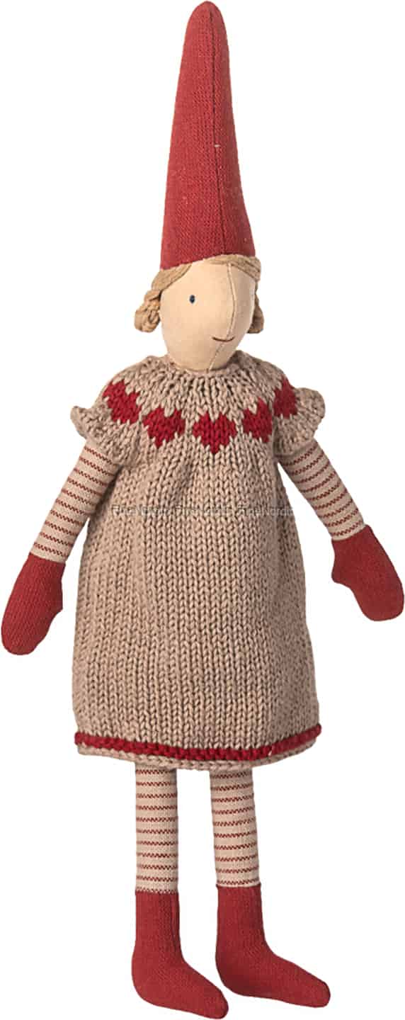 Stellen Sie sich die leise Vorfreude des Weihnachtsmorgens vor, eingefangen in diesem bezaubernden Maileg Wichtel. Gekleidet in ihr gemütlichstes Strickkleid, ist sie bereit, an den festlichen Traditionen Ihrer Familie teilzuhaben und über die sanften Momente der Saison zu wachen.