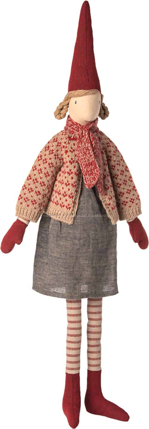 Heißen Sie ein Stück skandinavischer Weihnachtsfolklore in Ihrem Zuhause willkommen. Dieses bezaubernde Maileg Wichtelmädchen mit seinem freundlichen Lächeln und der gemütlichen Winterkleidung ist bereit, die kostbarsten Festmomente Ihrer Familie zu teilen.