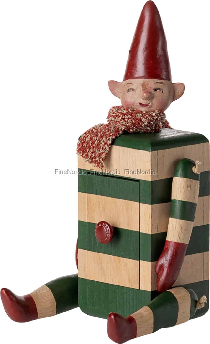 Stellen Sie sich vor, wie ein fröhlicher Wichtelfreund in dieser Weihnachtszeit über Ihr Zuhause wacht, mit einem sanften Lächeln auf den Lippen. Dieser bezaubernde Charakter aus Holz von Maileg bringt nicht nur festlichen Geist mit sich; er birgt ein winziges Geheimnis in seinem grün gestreiften Körper.