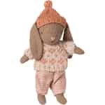 Stellen Sie sich einen klaren Wintertag vor, an dem winzige Fußspuren den Schnee zieren. Dieser süße Hase mit seinem warmen, braunen Textilkörper ist für diesen Anlass perfekt gekleidet. Fühlen Sie die Weichheit seines grob gestrickten Pullovers, der mit zarten rosafarbenen Winkeln gemustert ist, und bewundern Sie den kleinen Bommel auf seiner passenden Mütze. Seine kleine karierte Hose ist ideal für Nachmittage an einem Miniaturkamin, an dem er Geheimnisse mit anderen Maileg-Freunden teilt.
