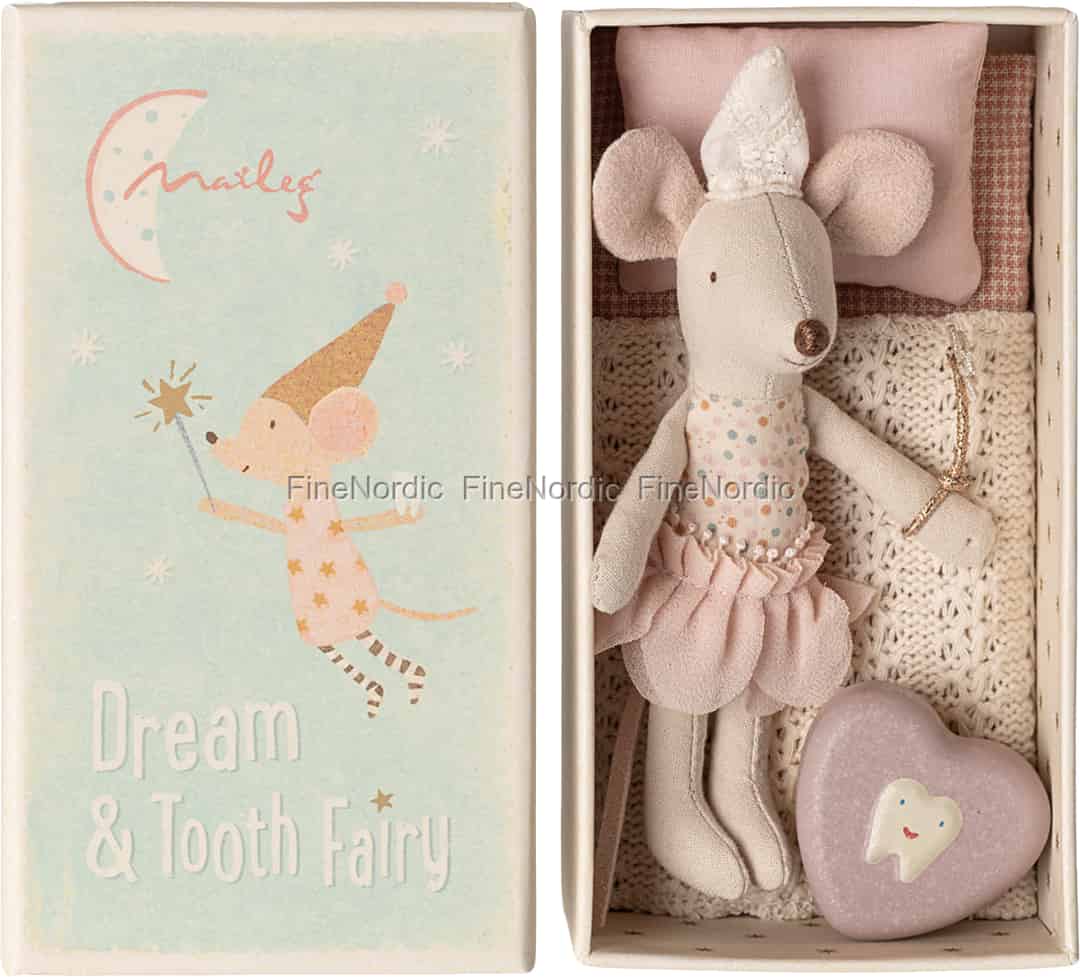 Die Tradition der Zahnfee ist einer der zauberhaftesten Momente des Staunens in der Kindheit. Mit der Maileg Zahnfee-Maus kannst du diese magische Geschichte auf die bezauberndste Weise zum Leben erwecken. Wenn ein Zahn in die wunderschöne herzförmige Dose gelegt wird, macht sich diese kleine Fee-Maus an die Arbeit, wacht die ganze Nacht über ihn und hinterlässt vielleicht eine kleine Münze. Sie ist eine wunderbare Begleiterin, um die Sorgen um einen Wackelzahn zu lindern.