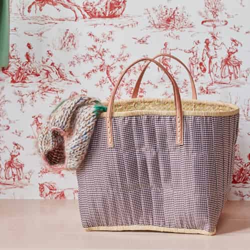 Rice Raffia Einkaufstasche - Stoffbezogen - Ledergriffe - Braun Vichy - Groß
