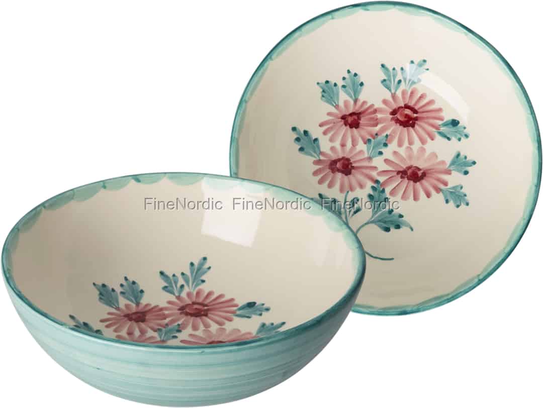 - Ein einzigartiges, handbemaltes Design: Jede Schüssel ziert ein entzückendes Blumenmotiv, handbemalt in zartem Rosa und Türkis, was jedem Stück seinen eigenen, einzigartigen und kunstvollen Charakter verleiht.