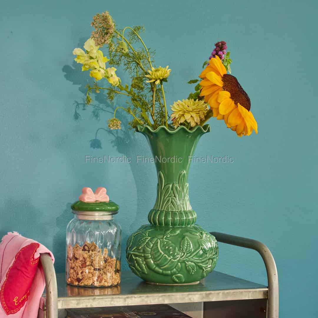 Lassen Sie den lebendigen Geist eines blühenden Gartens auf Ihrem Kaminsims oder Esstisch ein Zuhause finden. Diese atemberaubende Vase von Rice ist eine wahre Feier der Kunstfertigkeit der Natur, gefertigt aus Keramik und veredelt in einem tiefen, glänzenden Grün, das an die Farbe junger Blätter nach einem Frühlingsregen erinnert. Jede Rundung und jedes Detail ist darauf ausgelegt, zu begeistern – vom bauchigen Fuß, der von einem Teppich aus geprägtem Blattwerk umhüllt ist, bis zum eleganten Hals, der den Blick nach oben lenkt. Sie ist mehr als nur ein Gefäß für Blumen; sie ist ein eigenständiges Kunstwerk, das ein Gefühl von freudiger Fülle in Ihren Wohnraum bringt.
