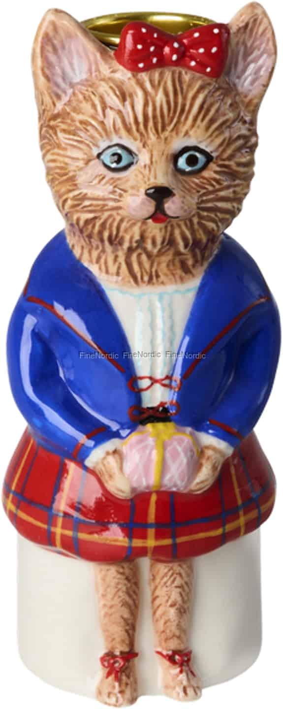 Treten Sie ein in eine Welt der reinen Fantasie mit diesem wunderschönen Kerzenhalter aus Keramik, der aus einer Zusammenarbeit zwischen Rice und der ikonischen französischen Künstlerin Nathalie Lété entstanden ist. Dies ist mehr als nur ein Wohnaccessoire; es ist eine Figur, die eine Geschichte zu erzählen hat. Mit ihren leuchtend blauen Augen, dem schicken Schottenrock und einem winzigen Geschenk in den Pfoten verkörpert sie eine freudige Erwartung und herzlichen Charme. Jedes Detail, von der Textur ihres Fells bis zur lebendigen, glänzenden Glasur, spiegelt den unverkennbaren Folk-Art-Stil der Künstlerin wider und verwandelt einen einfachen Kerzenhalter in ein geschätztes Erinnerungsstück.