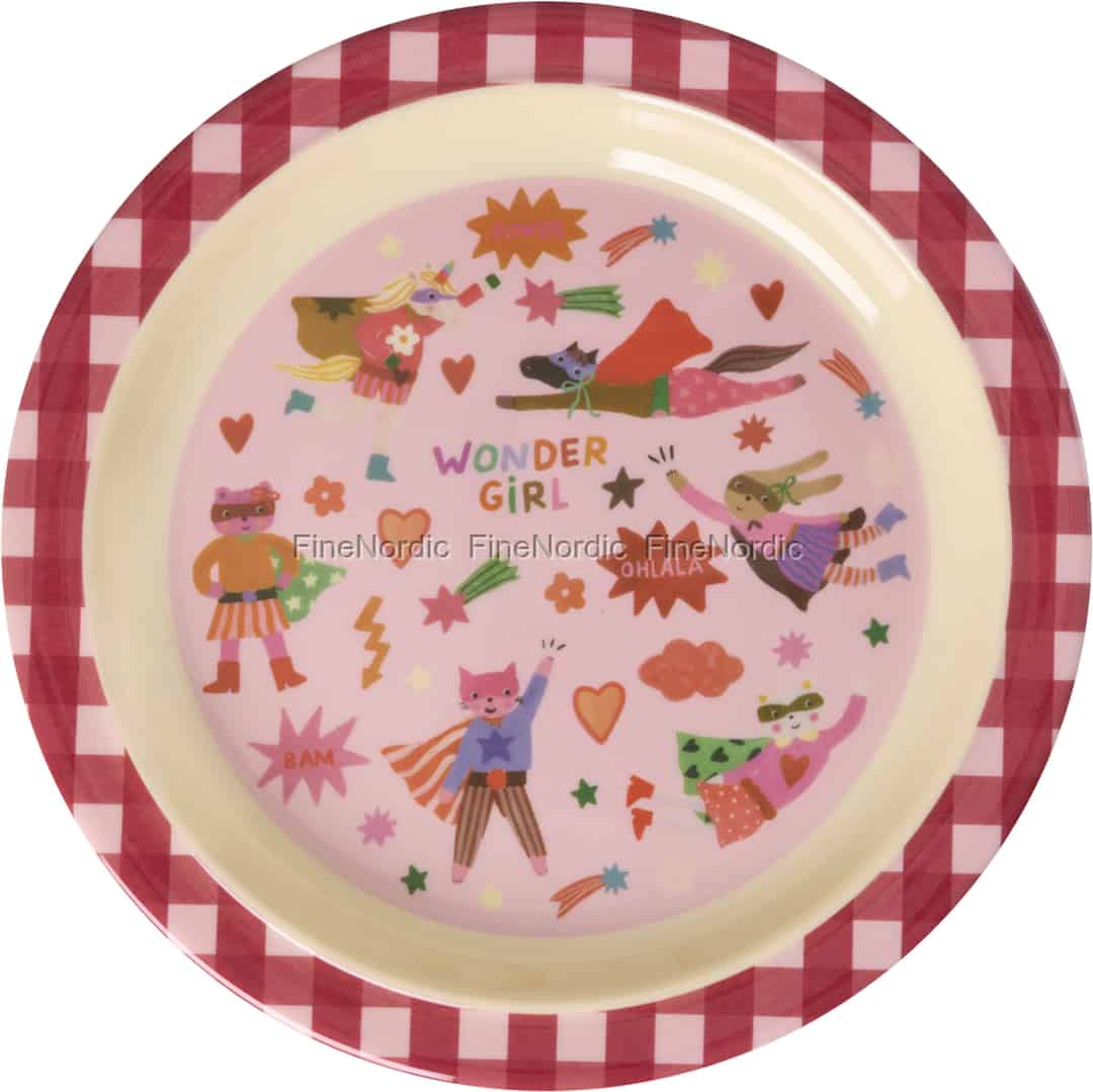 Von der renommierten dänischen Marke Rice ist dieser „Hero“-Teller mehr als nur Geschirr; er ist eine Einladung in eine Welt voller Abenteuer. Der fröhliche rot-weiß karierte Rand umrahmt eine Szene purer Freude, in der jede Figur bereit für den Einsatz ist. Stell dir vor, wie dein kleiner Schatz auf seinen Lieblingshelden zeigt und Geschichten über dessen Eskapaden erfindet, während er sein Mittagessen genießt. Das „Wonder Girl“-Motiv feiert die Stärke und Kreativität in jedem Kind und macht selbst einen einfachen Snack zu einem besonderen Anlass.