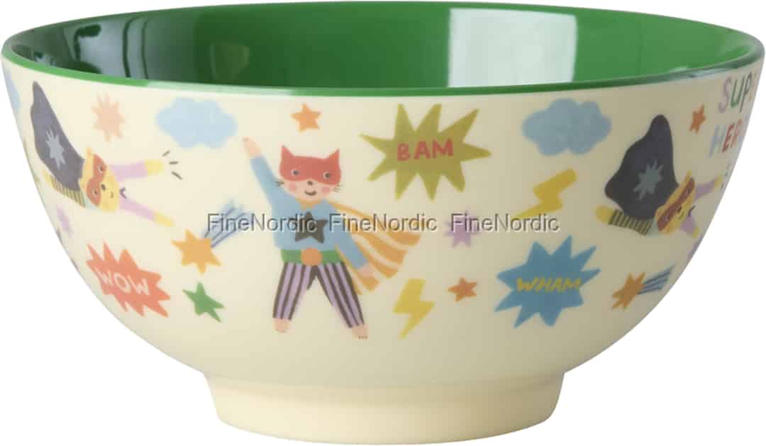 Jede Mahlzeit kann zu einem außergewöhnlichen Abenteuer werden – mit dieser wundervollen „Hero“-Schüssel von Rice. Die cremefarbene Außenseite bietet die perfekte Leinwand für ein Universum von maskierten Helden, die durch einen Himmel aus Sternen, Wolken und fröhlichen „WHAM!“-Geräuscheffekten fliegen. Es ist ein Design, das eine Geschichte erzählt und dein Kind dazu einlädt, mitzumachen und jeden letzten Bissen aufzuessen, um den Tag zu retten. Das leuchtende, glänzend grüne Innere sorgt für einen überraschenden Farbtupfer, der selbst einfache Snacks zu etwas Besonderem macht.