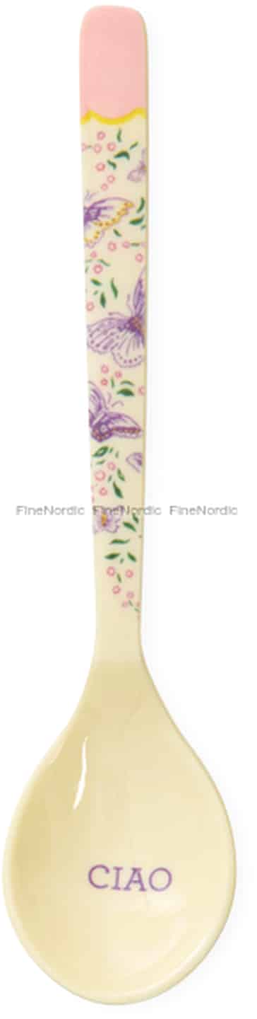 Warum sollten alltägliche Dinge schlicht sein? Rice glaubt daran, selbst den kleinsten Momenten Farbe und Freude zu verleihen, und dieser wunderschöne „Glory Days“-Teelöffel ist ein perfektes Beispiel dafür. Seine cremefarbene Basis ist eine Leinwand für eine entzückende Szene aus flatternden lila Schmetterlingen und zarten rosa Blüten, die eine unbeschwerte Leichtigkeit in Ihre Küche bringt. Die einfarbig rosa Spitze sorgt für ein modernes, farblich abgesetztes Finish, während das freundliche „Ciao“ in der Löffelschale bei jeder Benutzung einen warmen Gruß übermittelt. Es ist ein kleines Kunstwerk, geschaffen für Ihr tägliches Leben.