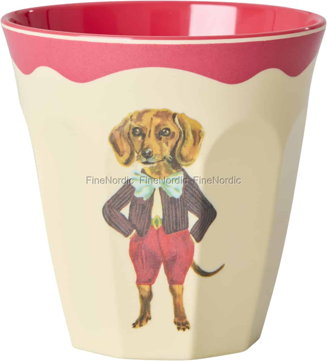 Entdecken Sie die entzückende Welt von Rice und der französischen Künstlerin Nathalie Lété, in der Alltagsgegenstände zu funktionalen Kunstwerken werden. Dieser mittelgroße Becher erzählt mit jedem Blick eine kleine Geschichte, in der ein wunderbar schicker Dackel in seiner feinsten Garderobe die Hauptrolle spielt. Die warme, cremefarbene Außenseite bietet die perfekte Leinwand für sein Porträt, während das leuchtende „Red Kiss“-Innere beim Trinken für einen überraschenden, fröhlichen Farbtupfer sorgt.