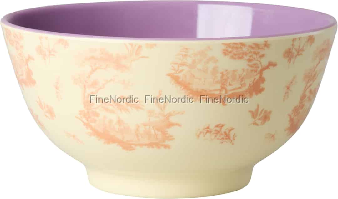 Bringen Sie mit dieser bezaubernden Melaminschale von Rice einen Hauch pastoraler Romantik auf Ihren Tisch. Ihr klassisches Toile-Muster erzählt eine Geschichte von idyllischen ländlichen Szenen, während ein überraschender, leuchtend violetter Farbtupfer im Inneren für einen fröhlichen, modernen Akzent sorgt.