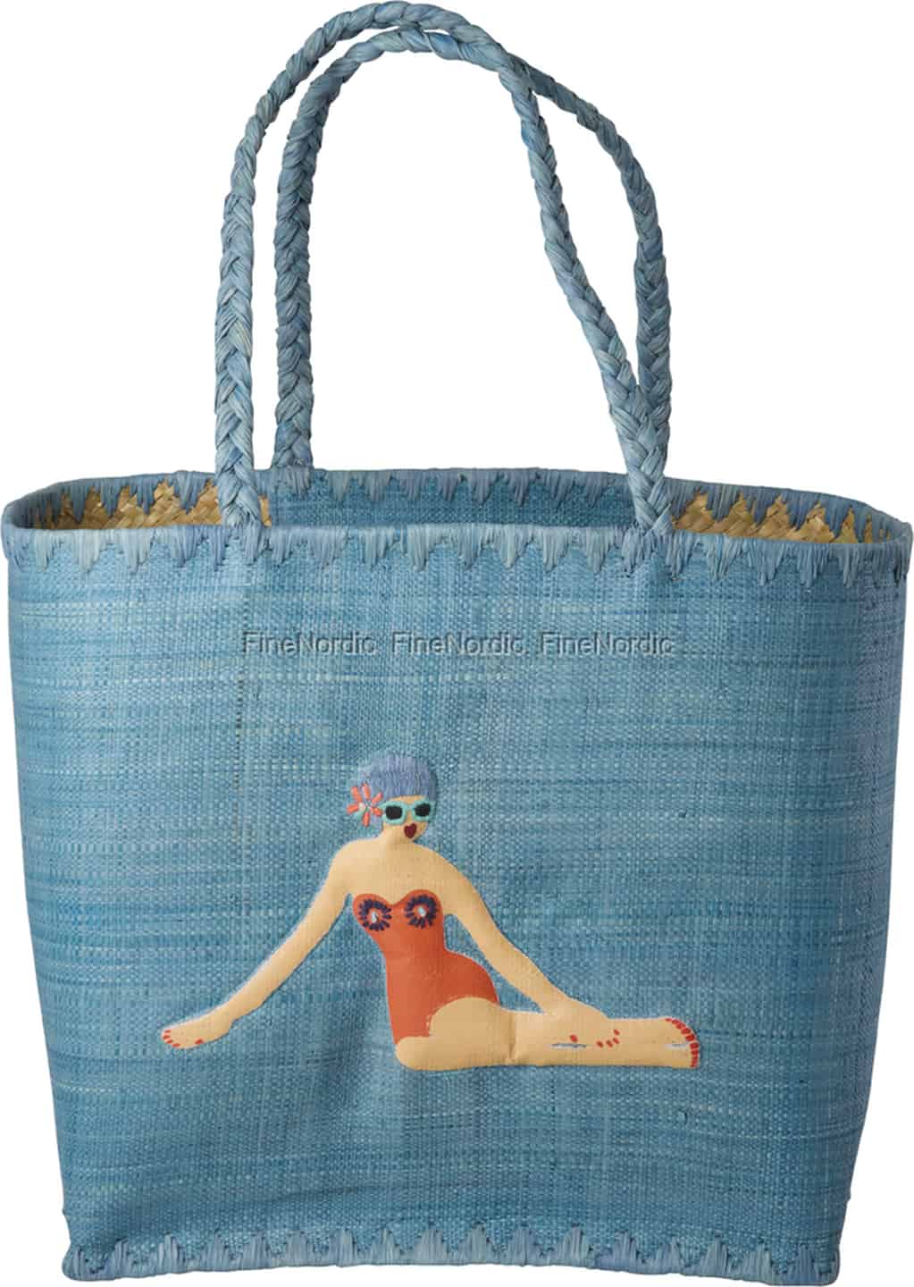 Stellen Sie sich einen perfekten Sommertag vor: Die Sonne wärmt Ihre Haut und eine sanfte Brise weht durch die Luft. Diese wunderschöne Raffia-Tasche von Rice ist dafür gemacht, genau dort bei Ihnen zu sein und die unbeschwerte Essenz dieser kostbaren Momente einzufangen. Das entzückende himmelblaue Geflecht ist die perfekte Kulisse für ihren Star: die charmante 'Lady Swimster', eine Applikation voller Retro-Charakter, die ihren eigenen glückseligen Tag der Muße zu genießen scheint. Ihre Anwesenheit verwandelt eine einfache Tasche in ein Gesprächsthema, eine Hommage an die glamourösen Seebad-Urlaube der Vergangenheit.