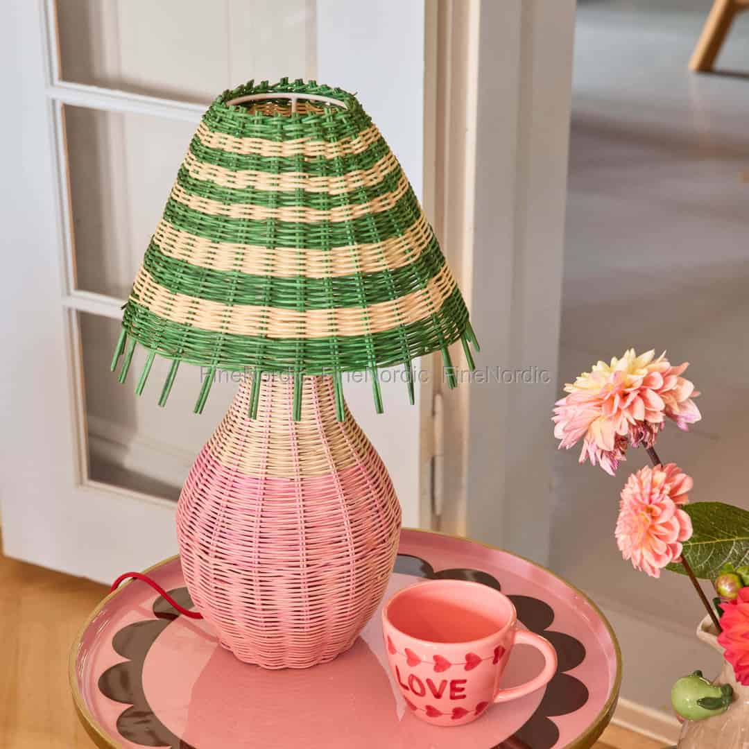 Stellen Sie sich ein sanftes, warmes Licht vor, das durch Streifen aus fröhlichem Rosa und leuchtendem Grün scheint. Diese wunderschöne Tischlampe von Rice ist mehr als nur eine Lichtquelle; sie ist ein handgefertigtes Stück Glück, das entworfen wurde, um Ihnen ein Lächeln ins Gesicht zu zaubern.
