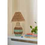 Diese große Tischleuchte von Rice verkörpert den verspielten Geist des dänischen Designs und ist eine Hommage an Farbe, Textur und Handwerkskunst. Jede Leuchte wird kunstvoll aus natürlichem Bast geflochten, was ihr einen einzigartigen, handgefertigten Charakter verleiht, der sich sowohl authentisch als auch charmant anfühlt. Der vasenförmige Fuß ist eine Leinwand für fröhliche Streifen in erdigem Braun, sanftem Creme und einem erfrischenden Hauch von Türkis, die Ihrem Interieur ein Gefühl von Wärme und Persönlichkeit verleihen. Es ist ein Stück, das eine Geschichte von Kunstfertigkeit und glücklichen Momenten erzählt.