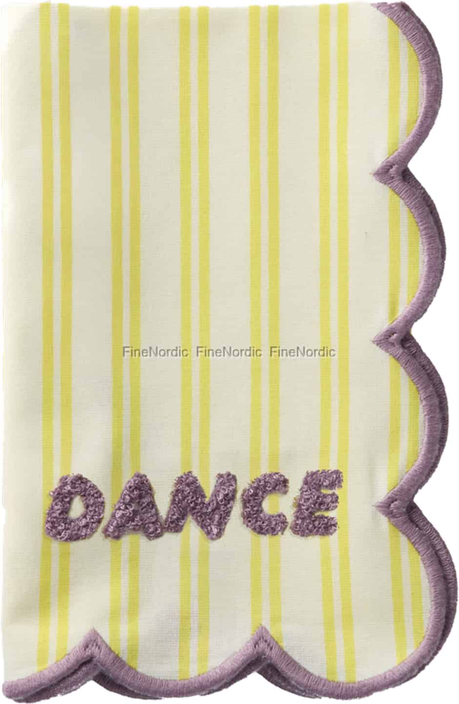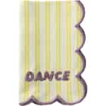 Lassen Sie Ihre Tischdekoration mit dieser bezaubernden Serviette von Rice ein Lied puren Glücks singen. Rice, bekannt für seine lebendigen Designs, präsentiert uns ein Stück, das perfekt den Geist eines sonnenverwöhnten Brunchs oder eines fröhlichen Familienessens einfängt. Die weiche, cremefarbene Baumwolle mit ihren heiteren gelben Streifen bietet eine reizende Leinwand für den Star der Show: die fröhliche Einladung zum "DANCE" in flauschiger lila Stickerei. Es ist ein kleines Detail, das einen großen Unterschied macht und jede Mahlzeit in ein kleines Fest verwandelt.