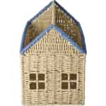 - Ein fröhlicher Farbtupfer: Der leuchtend blaue Rand, der das Dach und den oberen Rand säumt, sorgt für einen verspielten Farbtupfer, der wunderbar mit dem natürlichen Ton des geflochtenen Papiers kontrastiert.